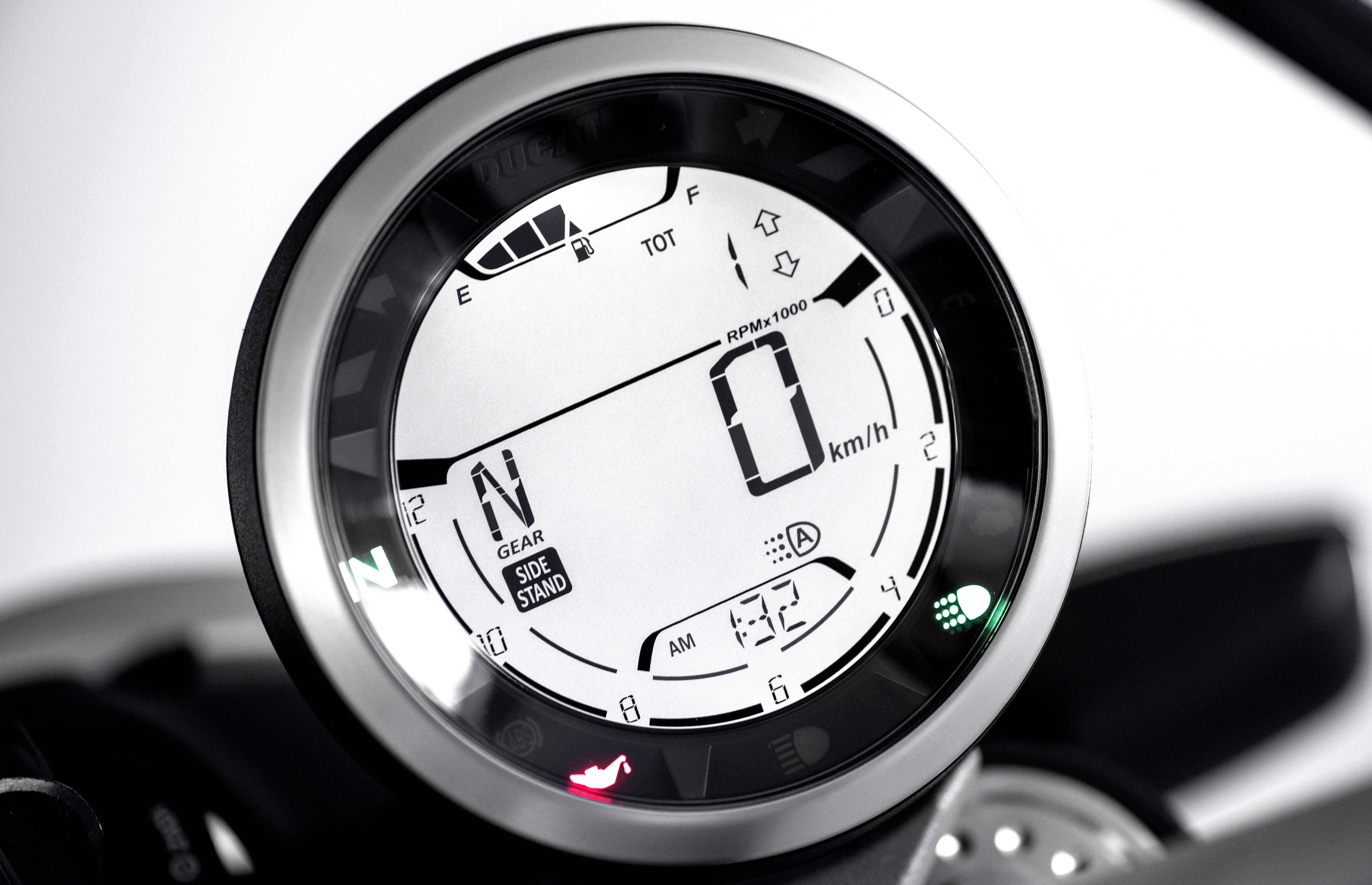 This bike features an improved suspension setup for enhanced ride comfort. Other standard features include handlebar switch controls, the Ducati Multimedia System, hydraulic clutch control with adjustable lever, and headlight with glass lens and daytime running light (DRL).